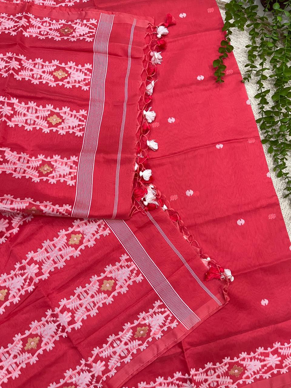 A celebration of craftsmanship – This saree is adorned with exquisite white thread work, making it a perfect choice for festive and elegant occasions.
