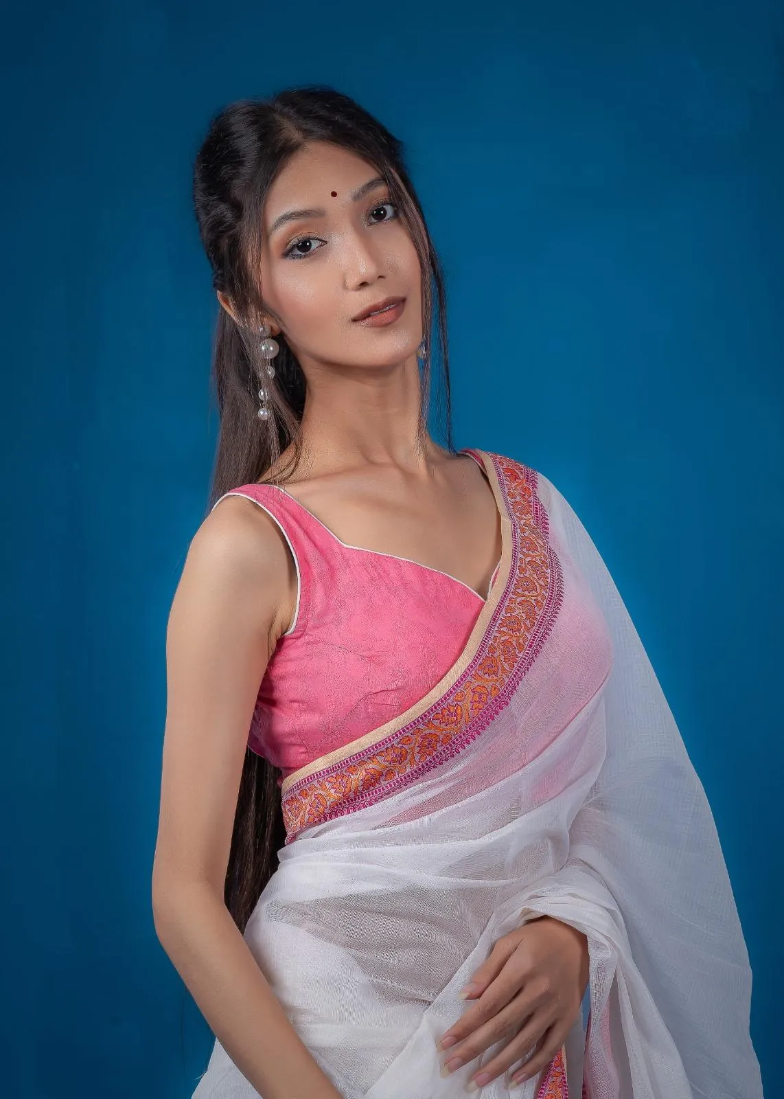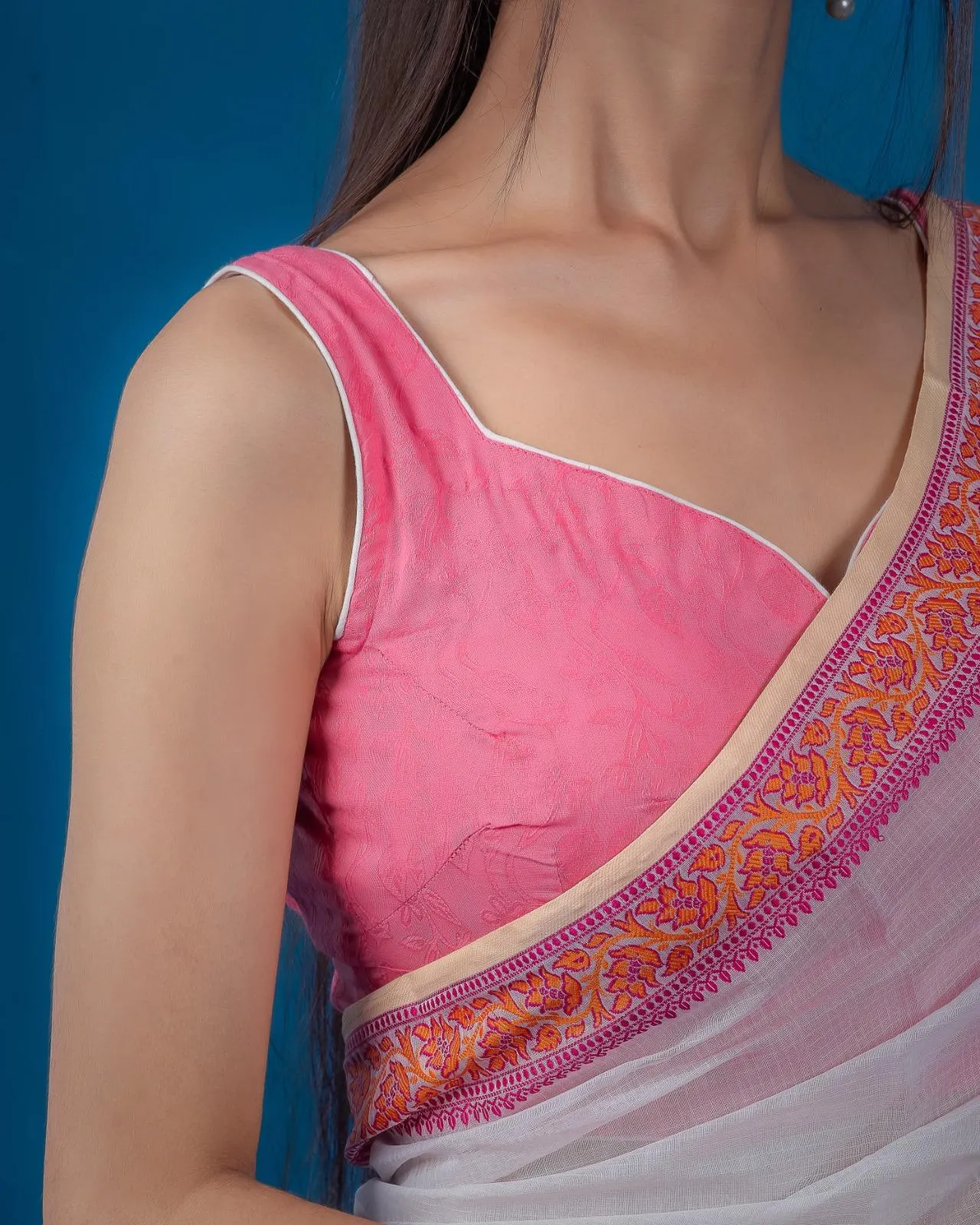 The ‘Bina’ Blouse comes in a soft, sweet-toned color perfect for pairing with your favorite saree. It features white piping to enhance contrast and elegance.