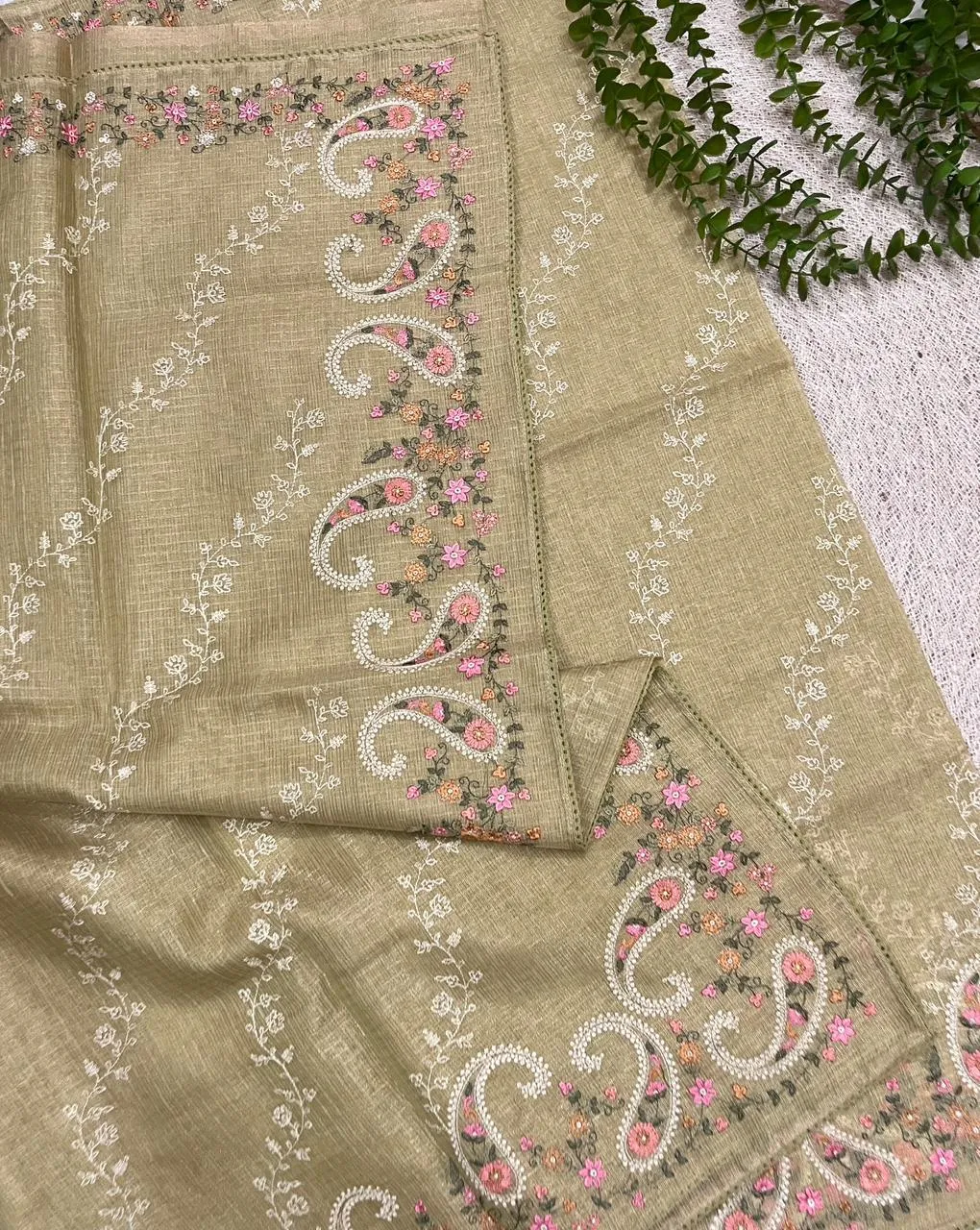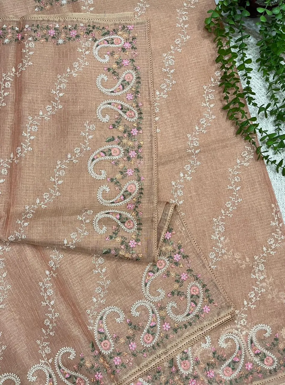 Regal and enchanting – An exclusive Kota silk creation adorned with elaborate geometric and vine-patterned silk thread embroidery. Its pastel lemon and rose gold tones create a soft, luxurious shimmer, perfect for evening functions and festive celebrations.