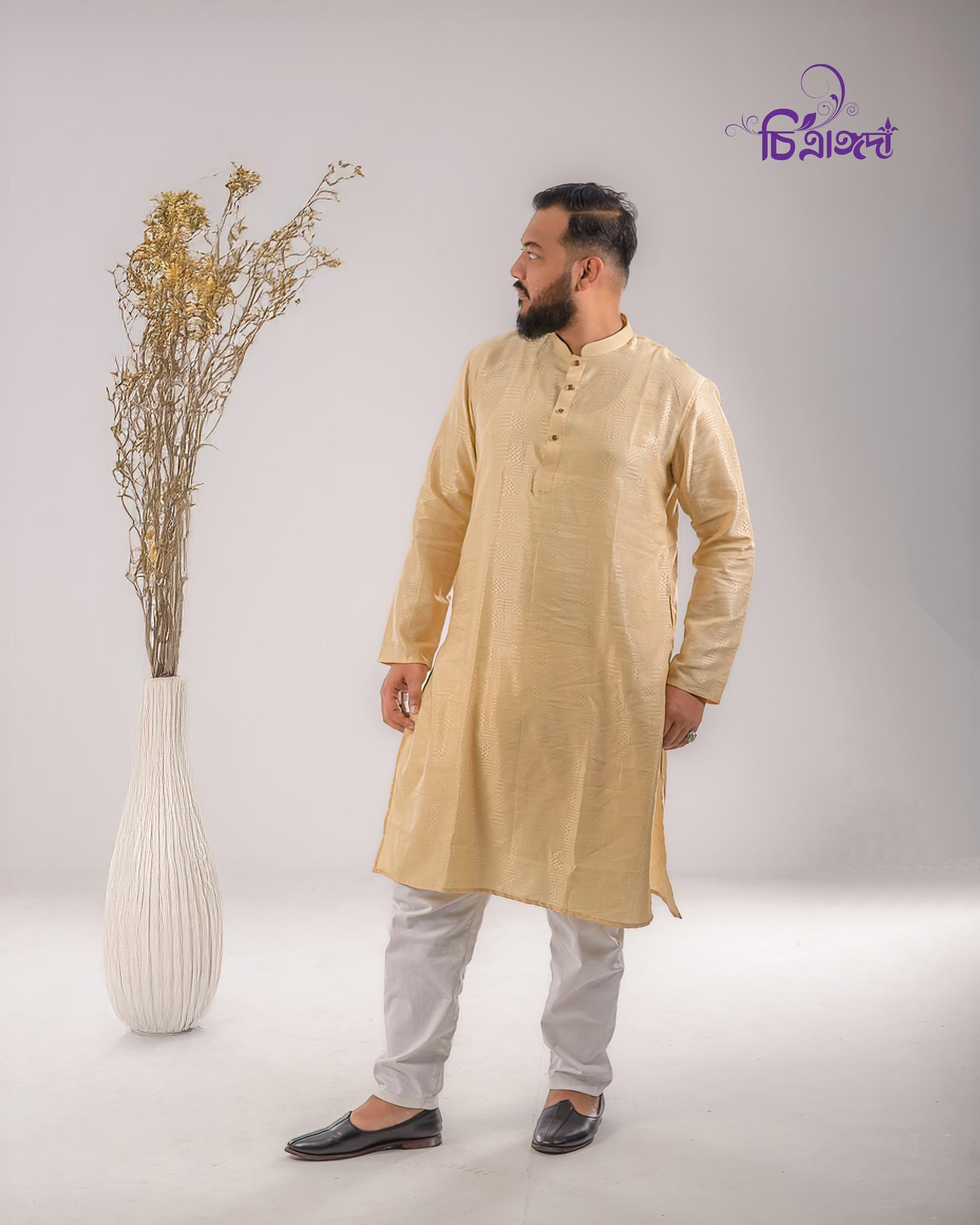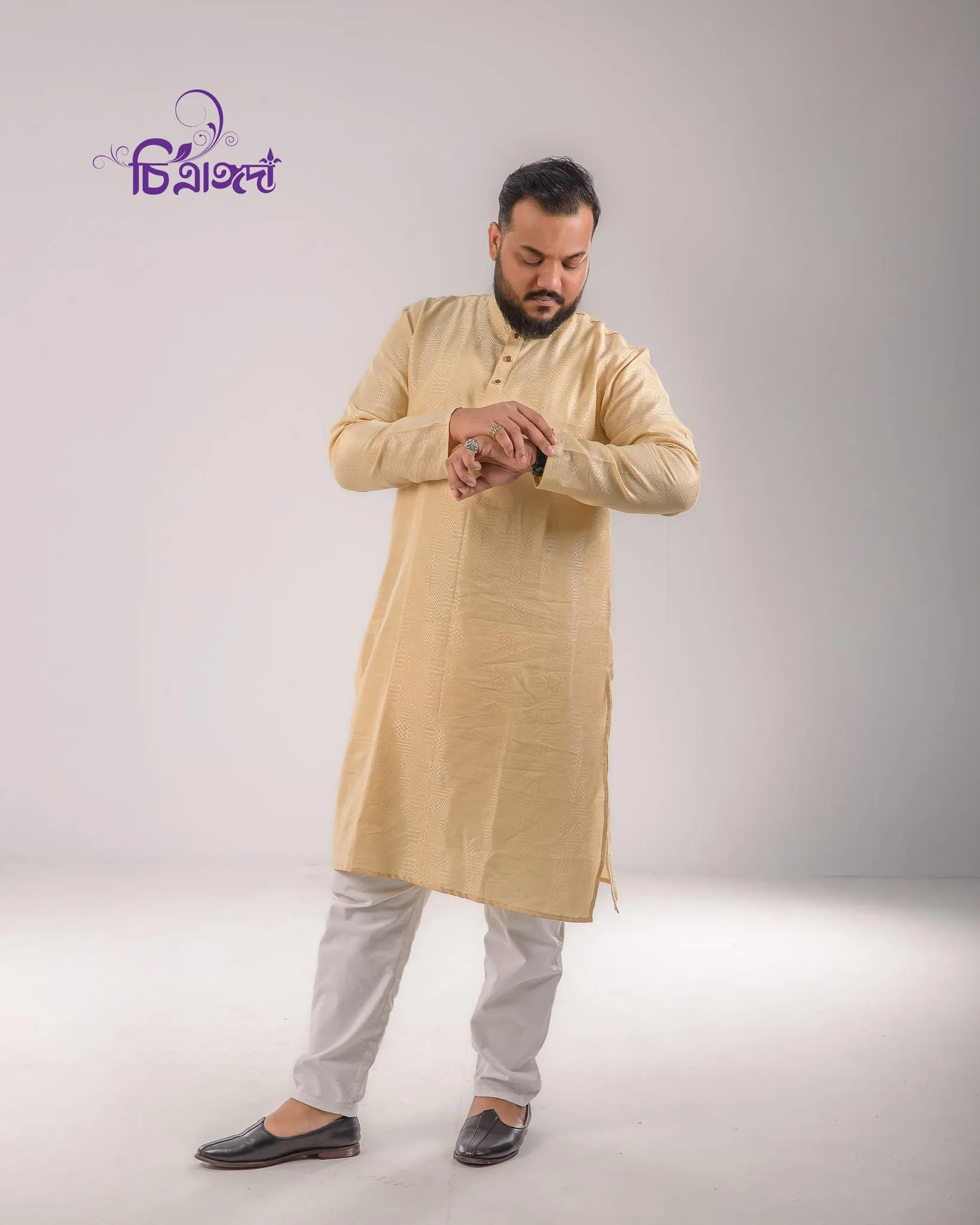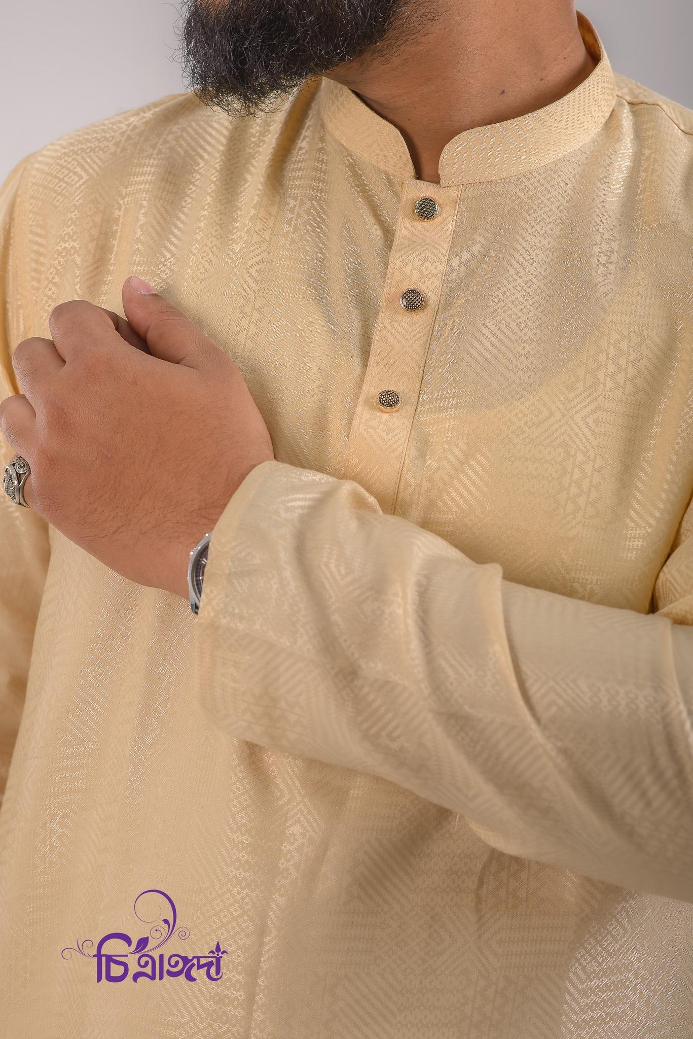 The Elijah Panjabi is made from premium-quality textured cotton, offering both comfort and sophistication. It comes in a rich golden shade and features stylish snap buttons for a modern finish.