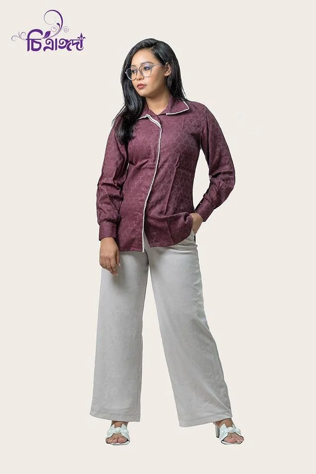 A chic shirt crafted from jacquard cotton fabric, enhanced with delicate crochet lace details. Available in sizes 36–46.