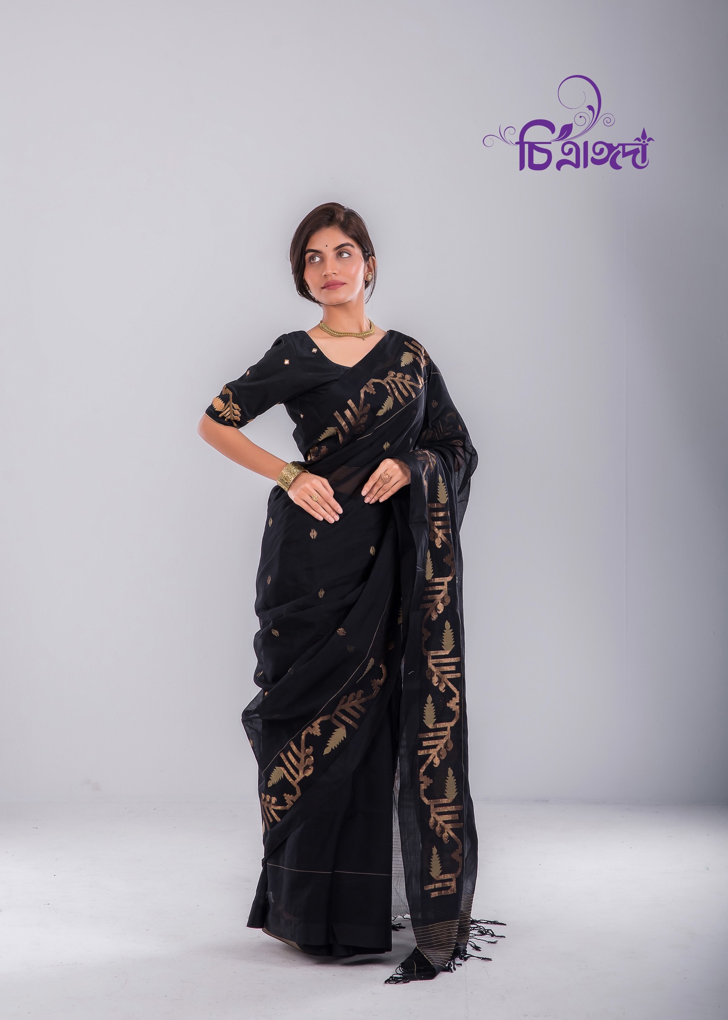 Lightweight, elegant, and full of craftsmanship, this 14-hath black saree includes a matching running blouse piece.
