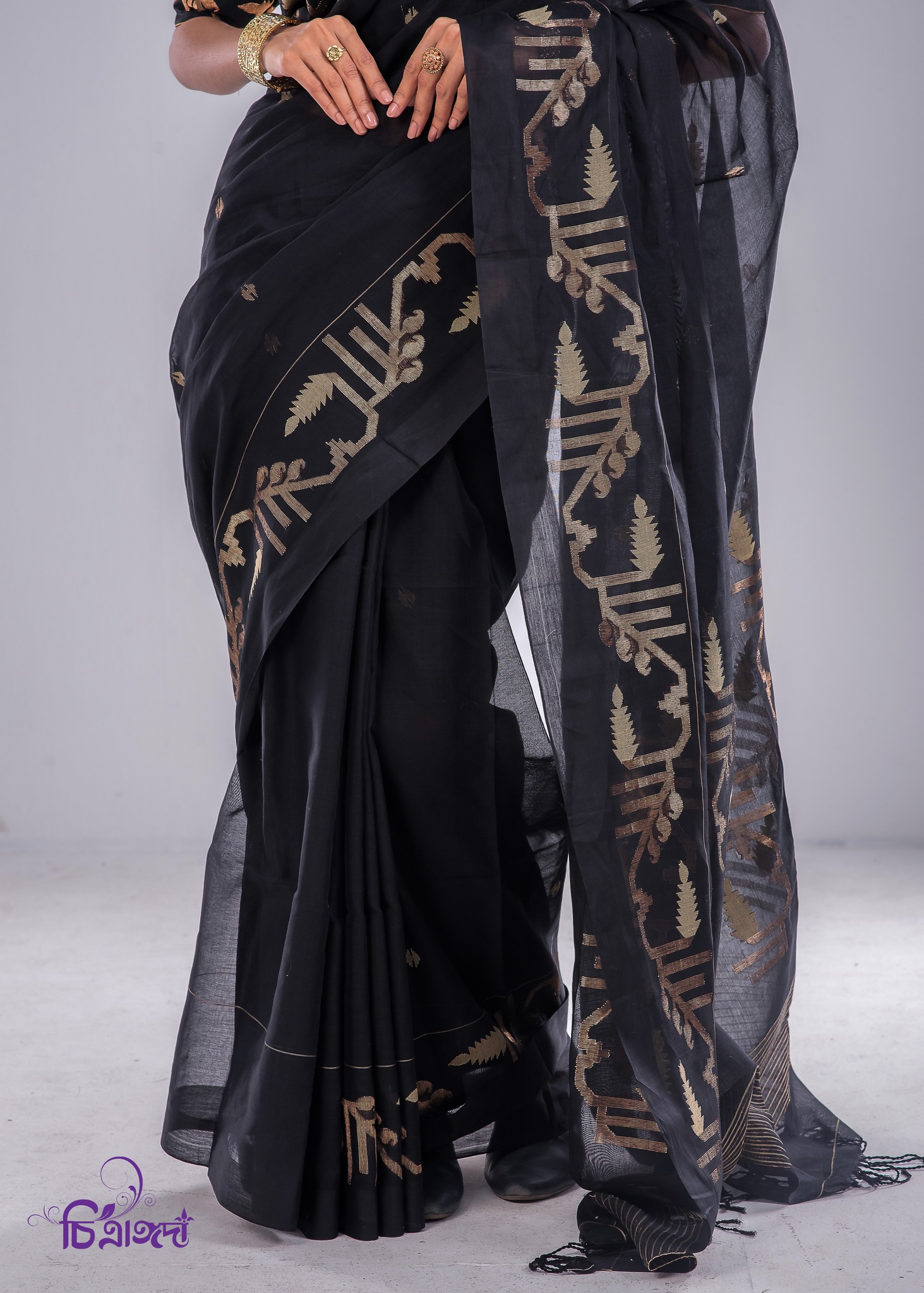 Woven on the traditional Tangail handlooms of Bangladesh, this saree features ultra-soft silk with intricate zari threadwork throughout.