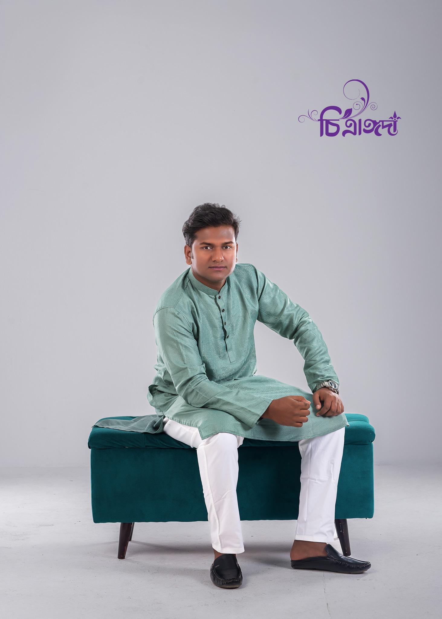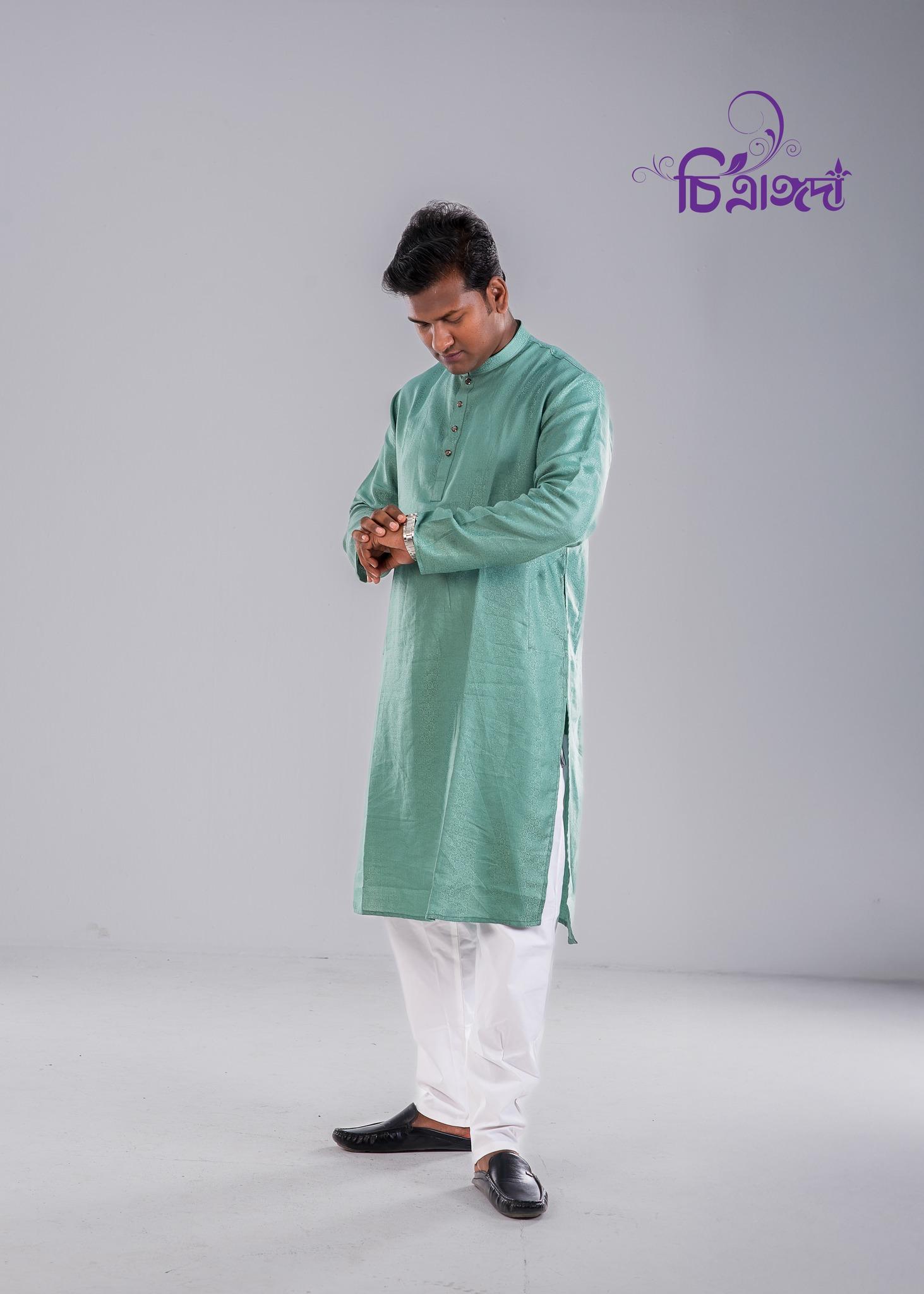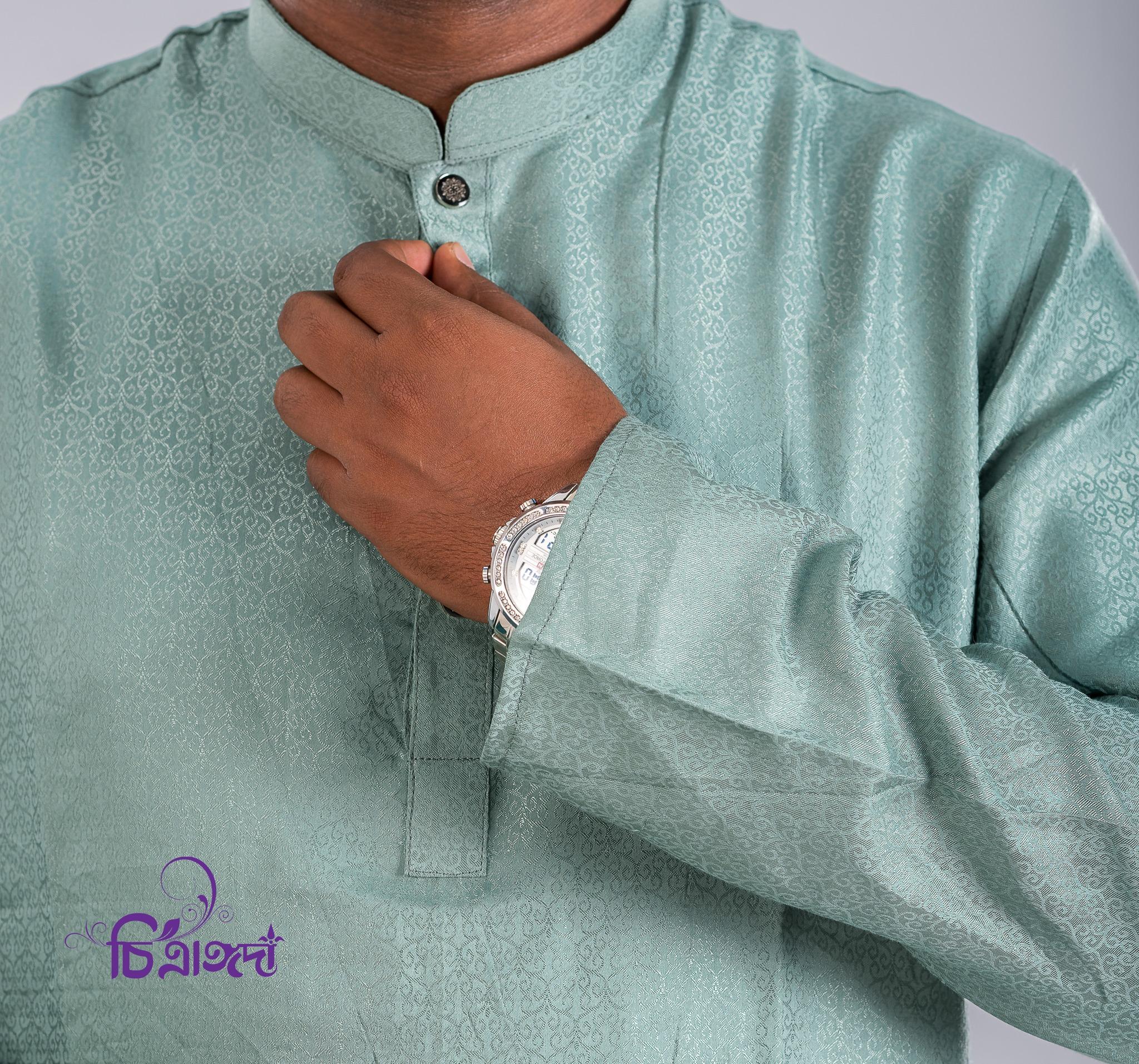 Made from premium-quality textured cotton, the Juliyan Panjabi offering a refined look with a touch of modern elegance. Its beautiful greenish-teal shade is complemented by stylish snap buttons for ease and sophistication.