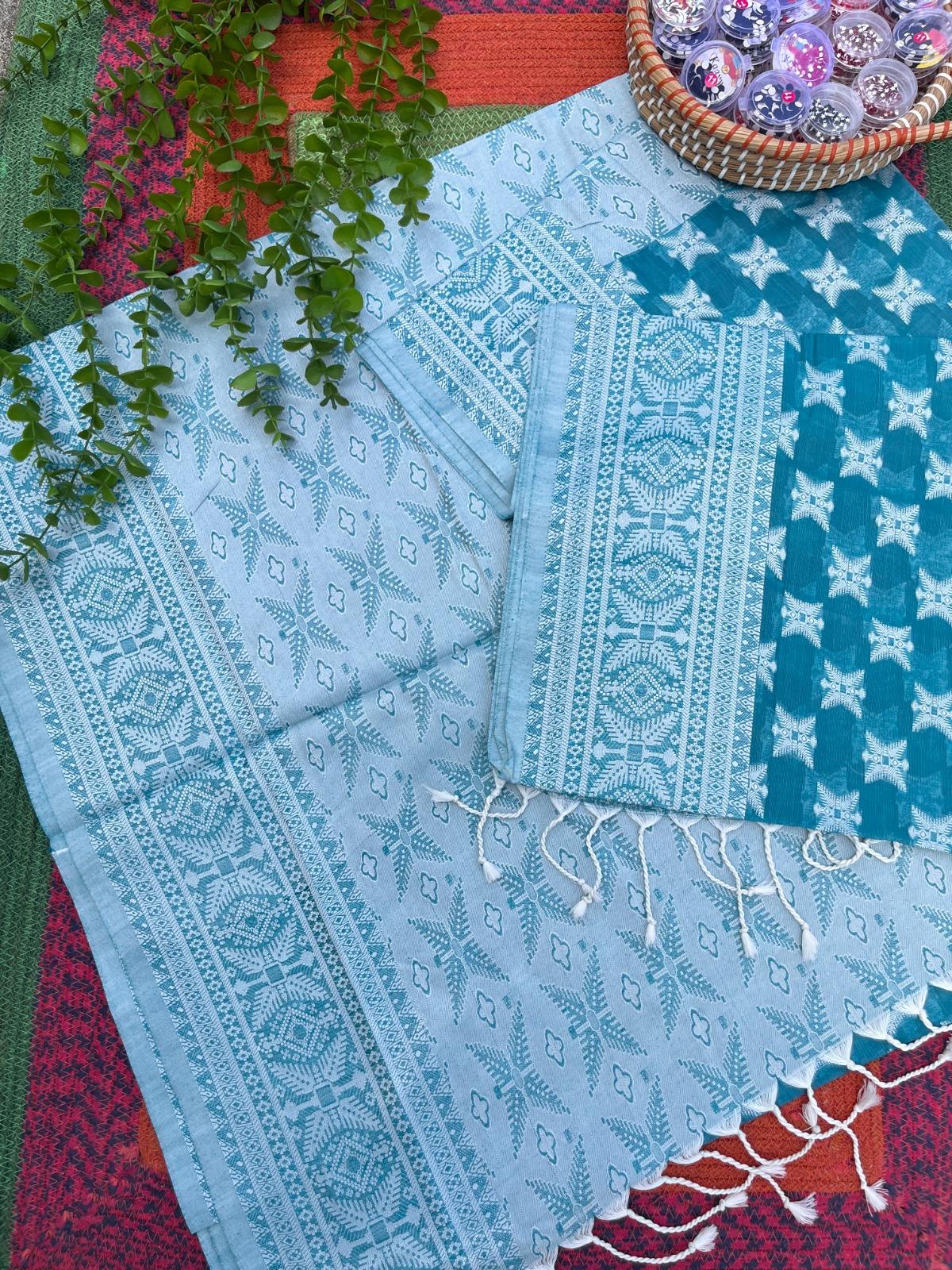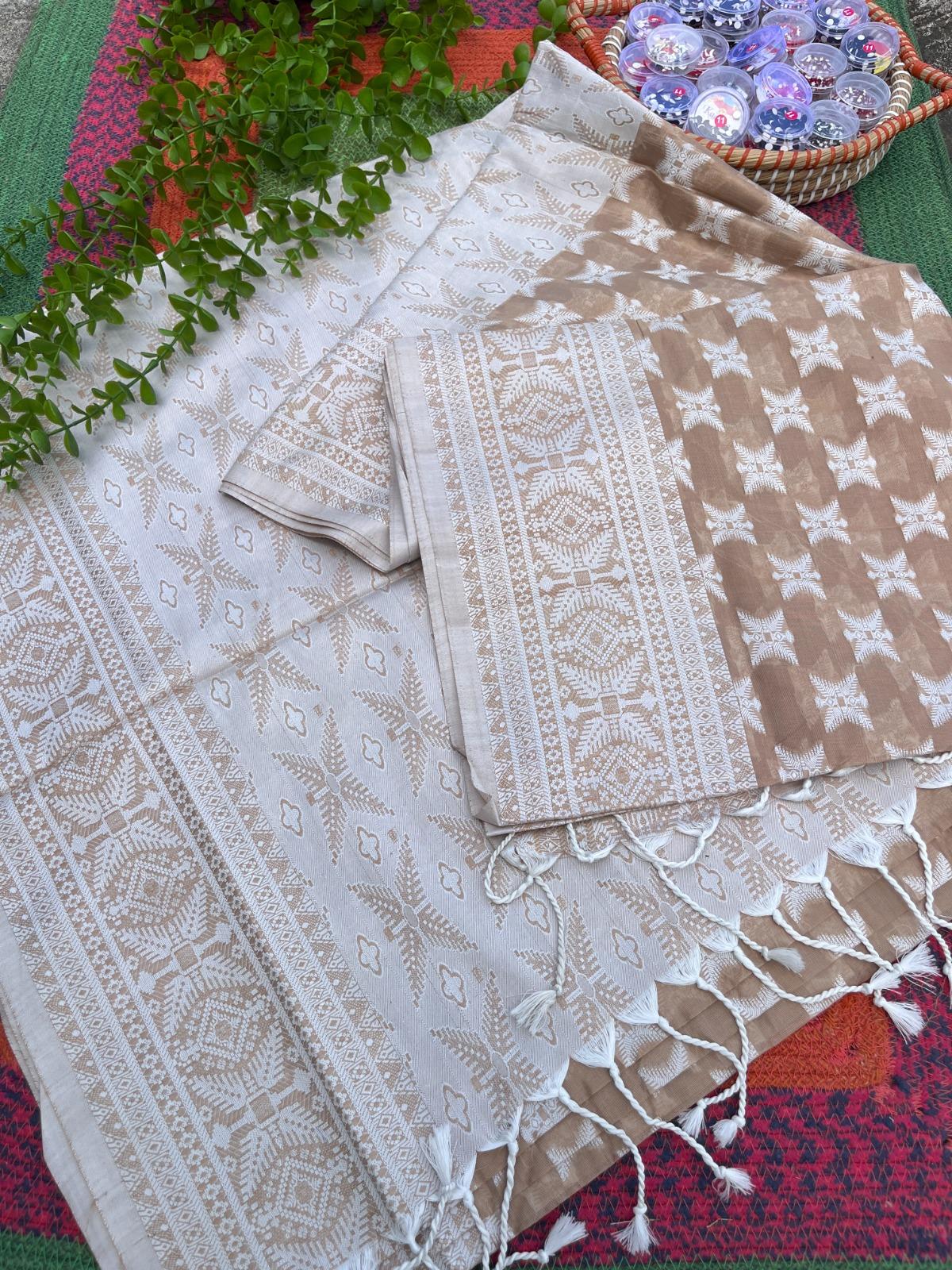 Chic and contemporary – Crafted from a luxurious blend of cotton and silk, featuring intricate silk thread work throughout. With its soft texture and elegant shimmer, this saree is perfect for both festive occasions and stylish everyday wear.