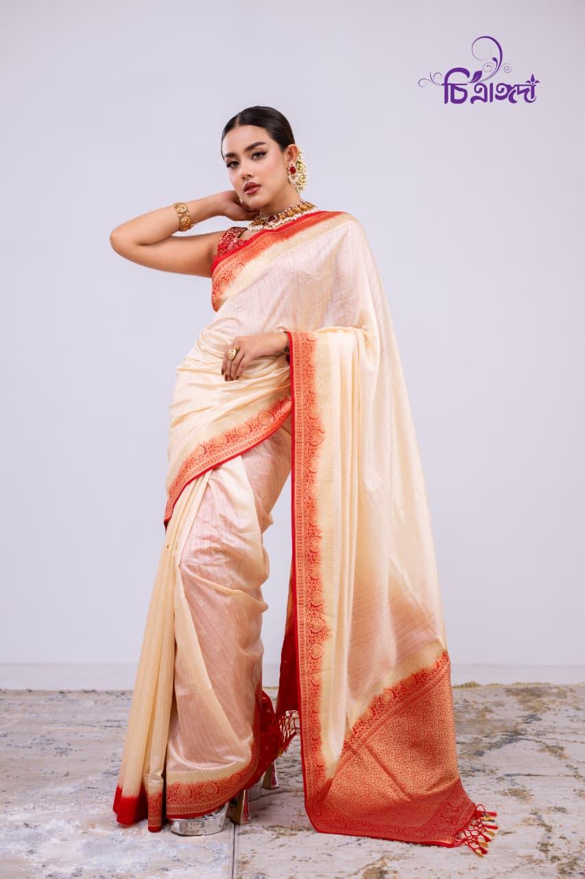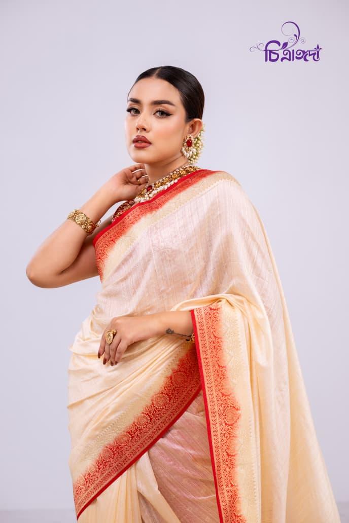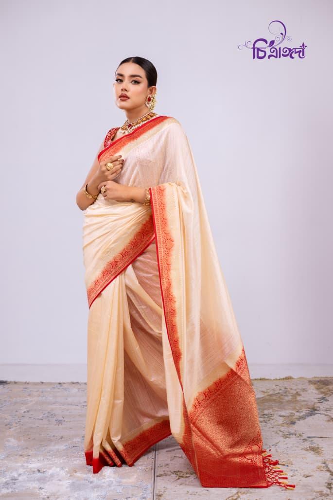 An exclusive masterpiece, featuring a classic cream color with a striking red border and achaal, designed to exude elegance and sophistication.