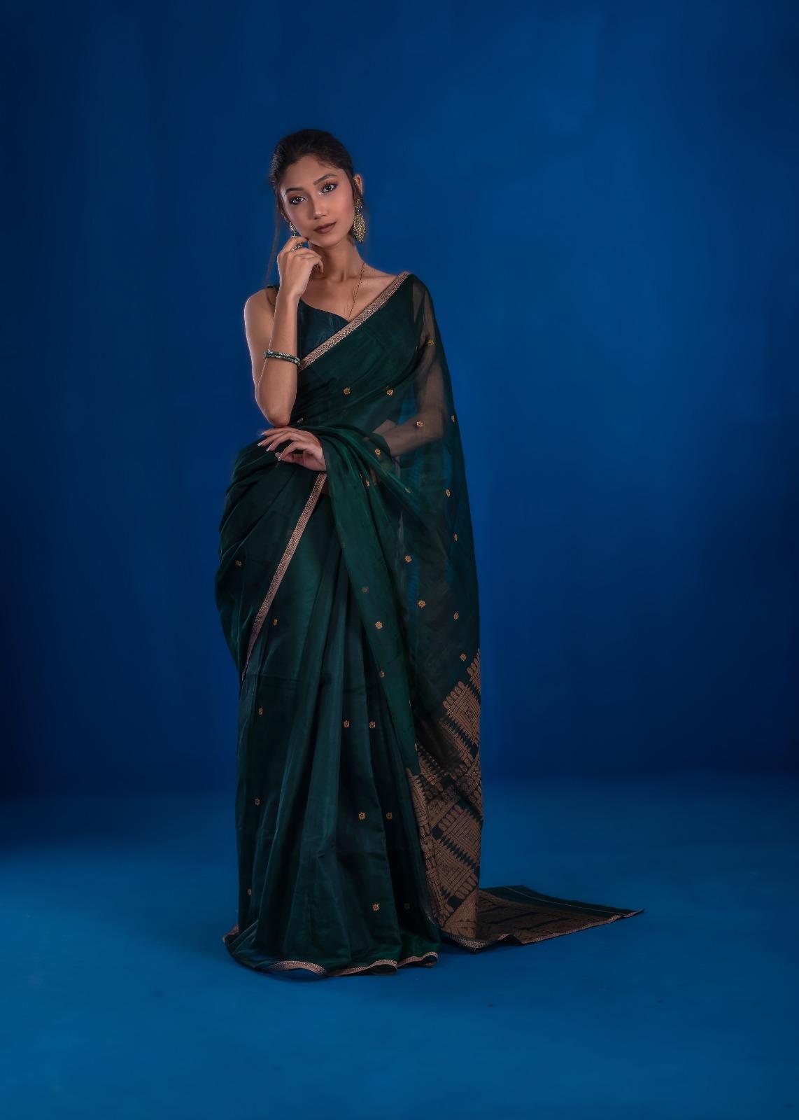 This 14-hath saree in deep green is especially eye-catching and takes nearly 5 days of skilled weaving by expert artisans.