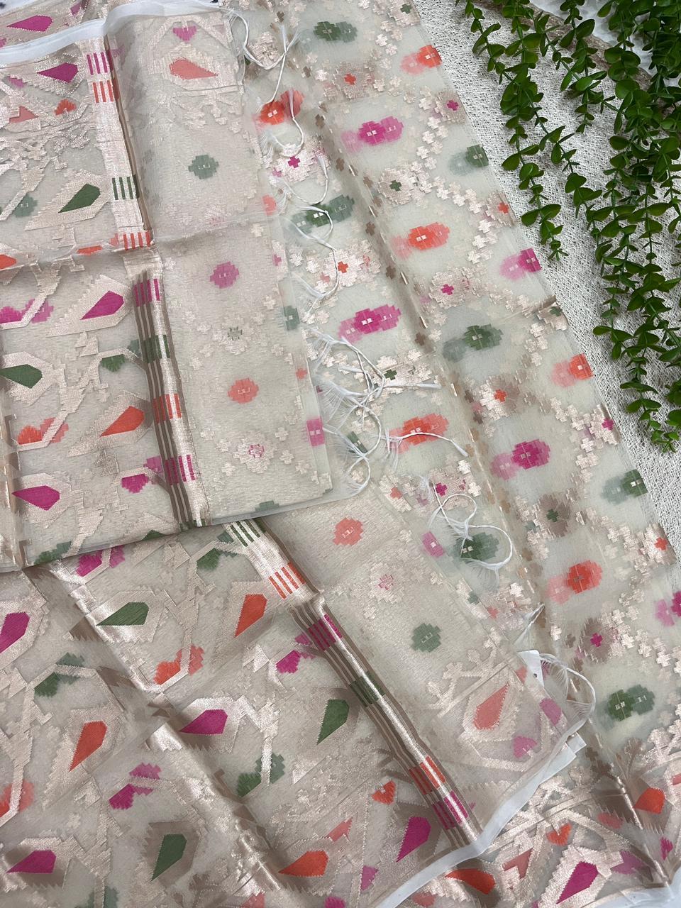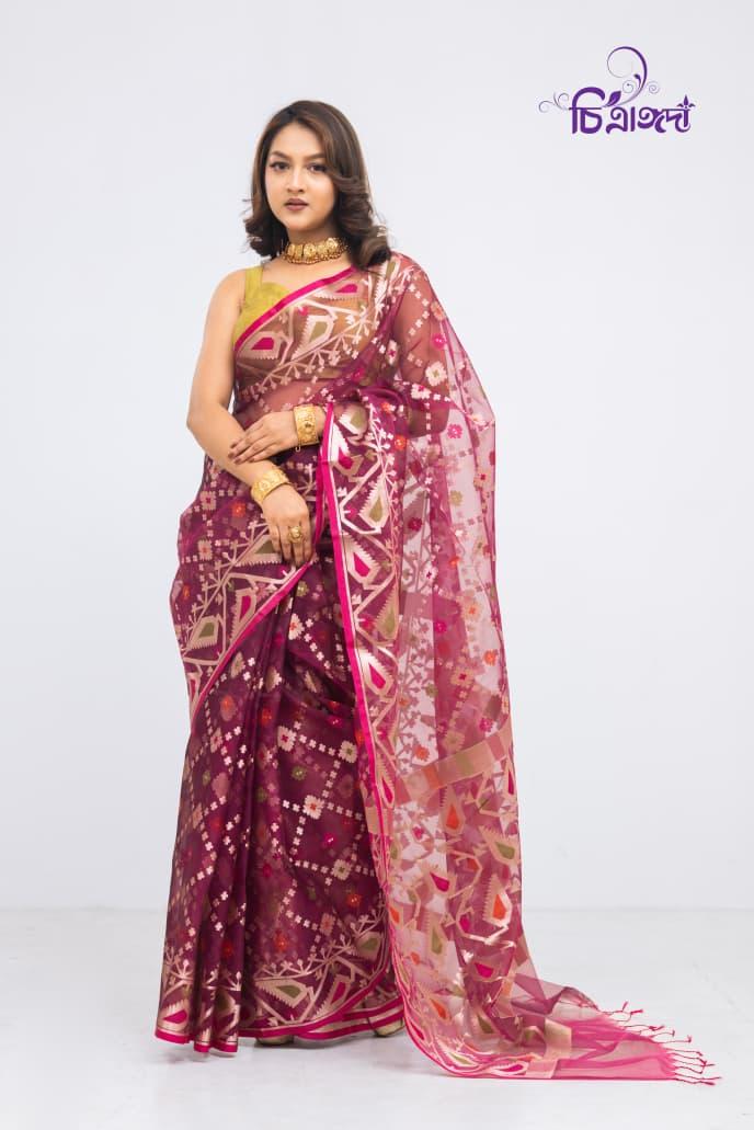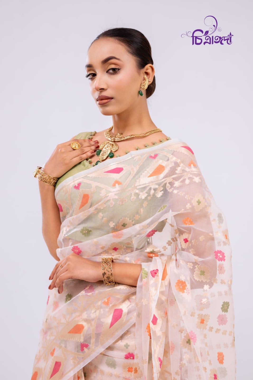 • Design: Traditional Jamdani motifs crafted with colorful threads and zari work, making the saree even more elegant and attractive.