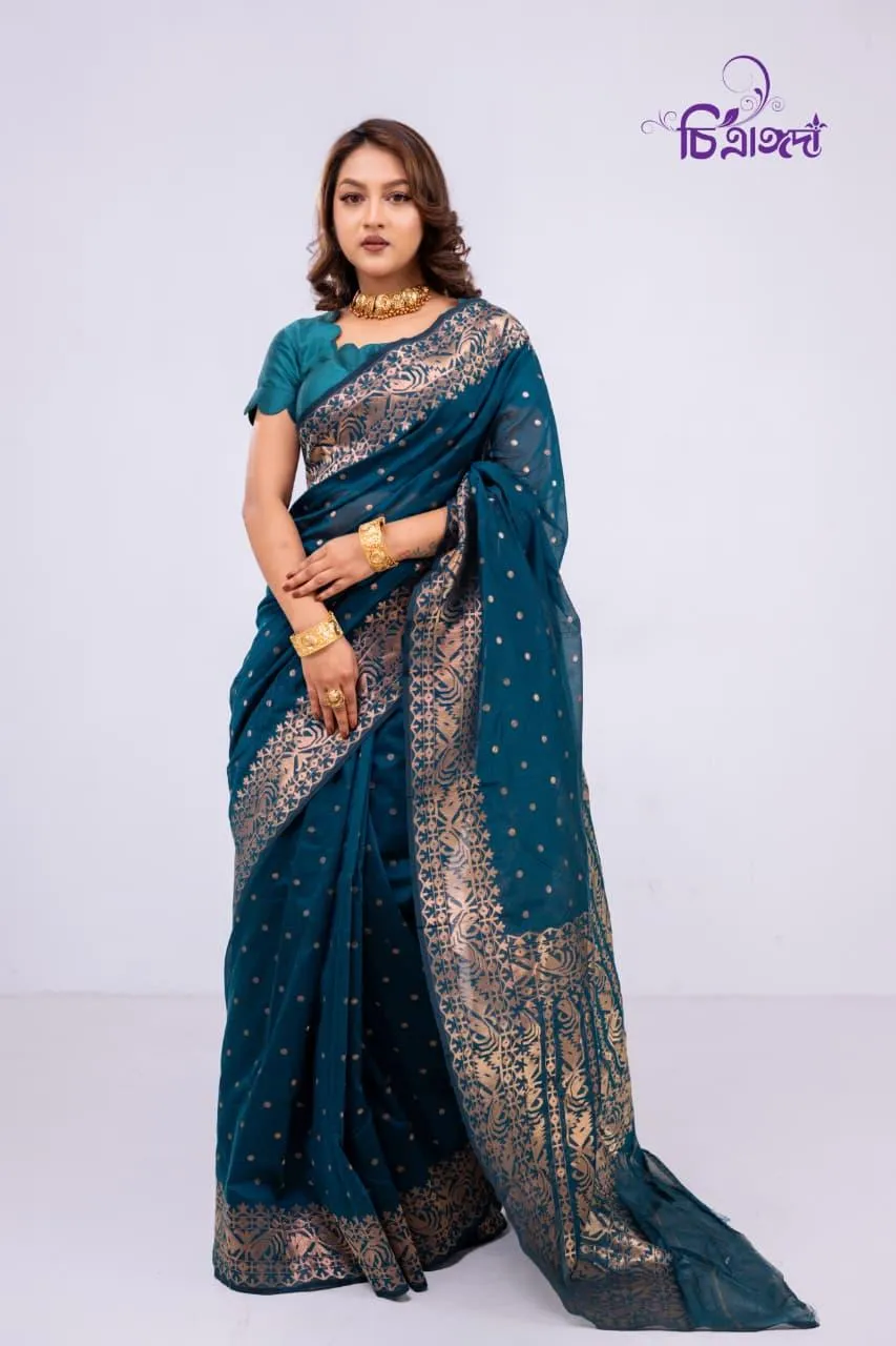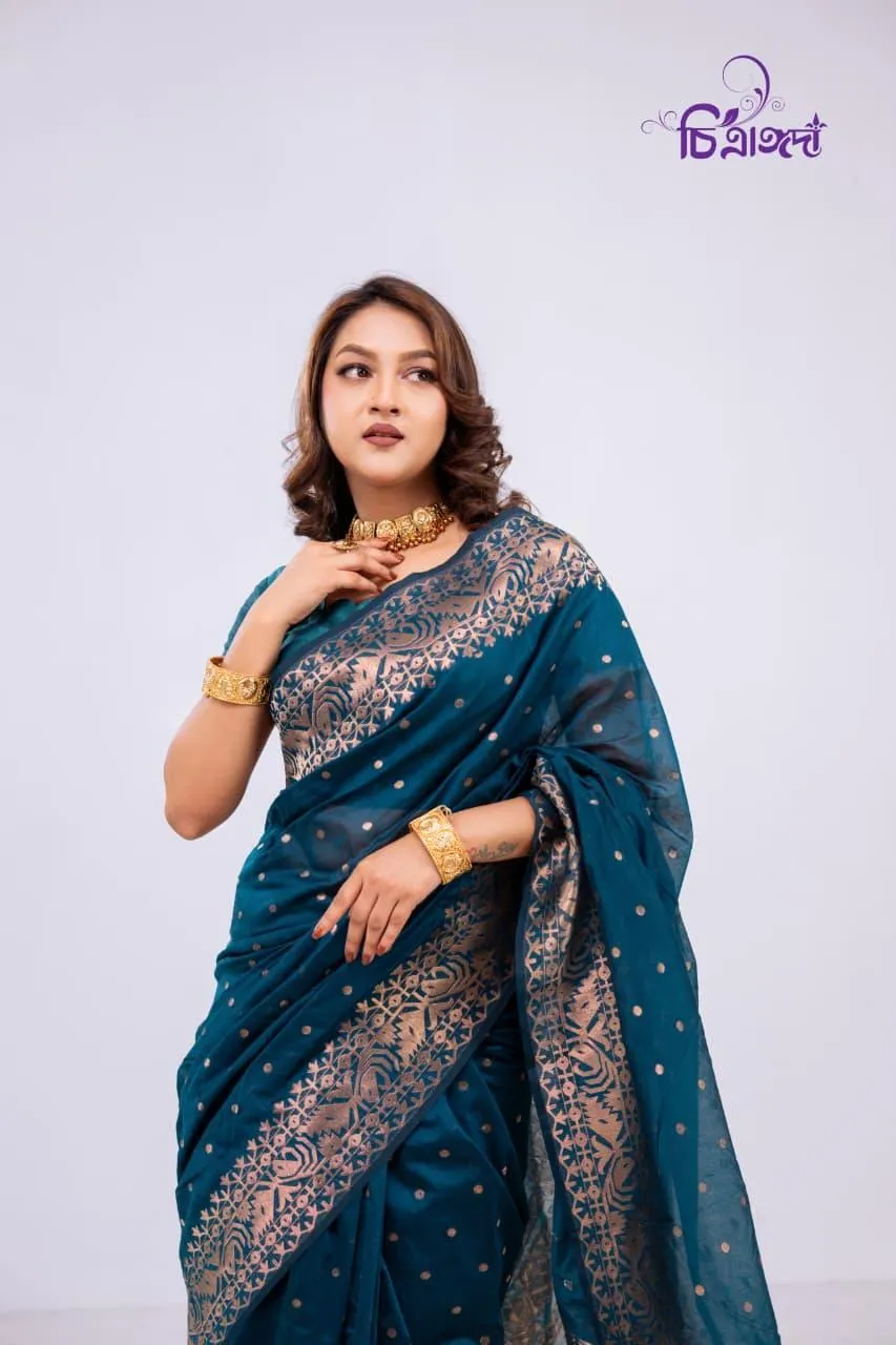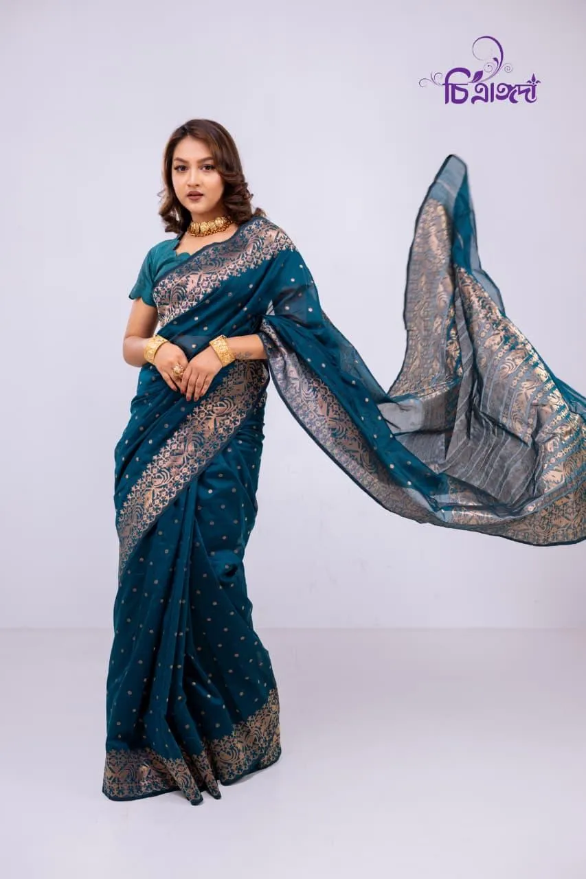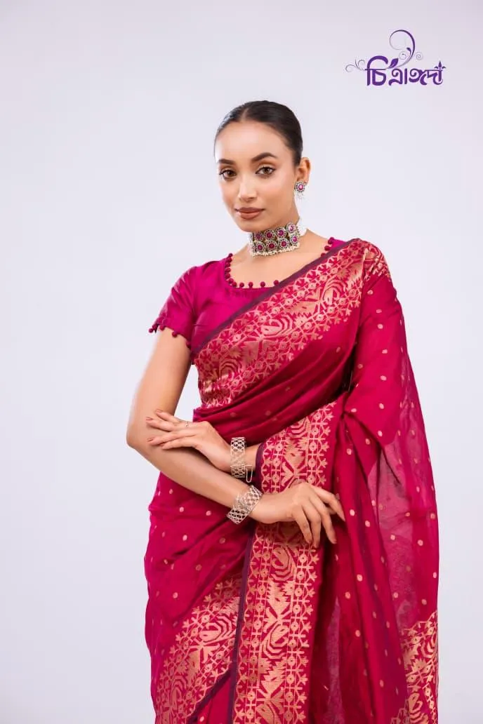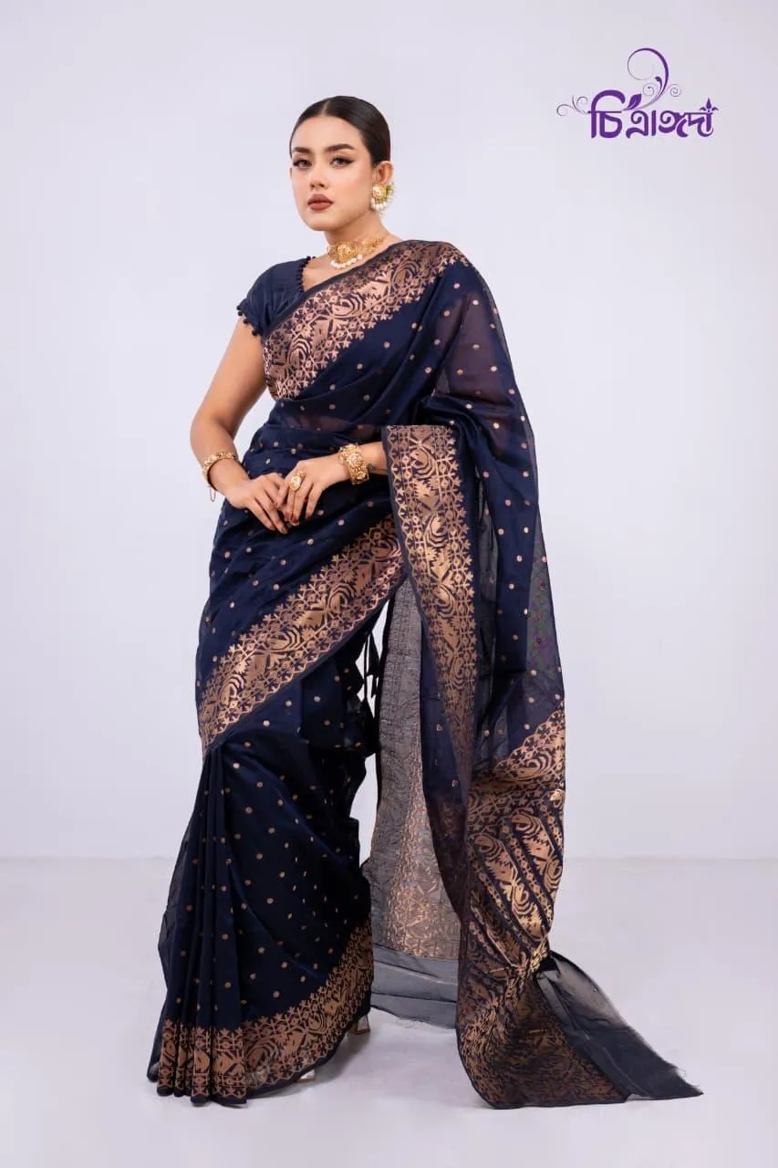 A graceful masterpiece that reflects the rich heritage of Tangail weaving, adorned with intricate jari work throughout.