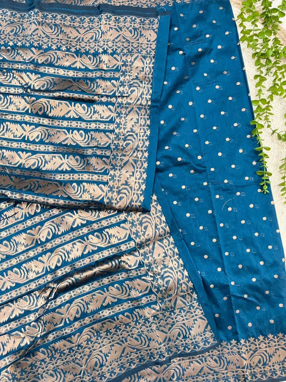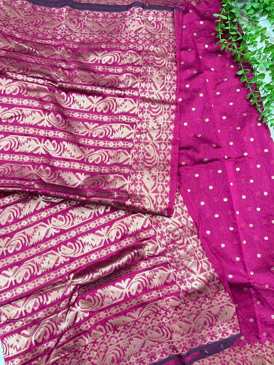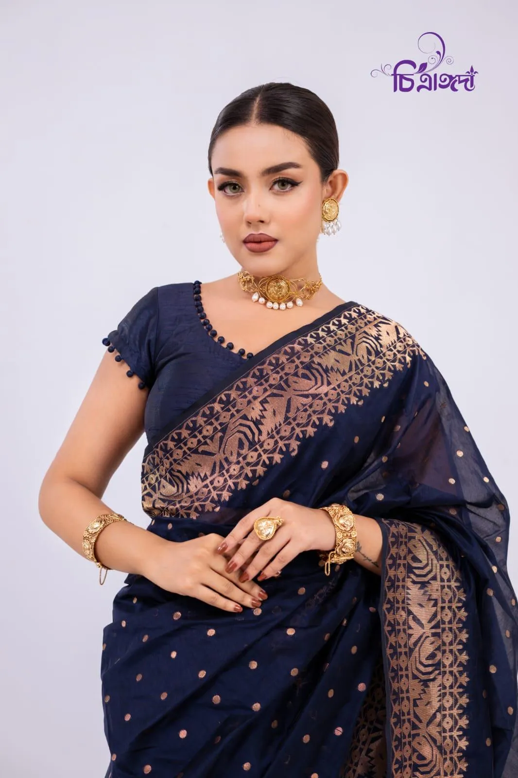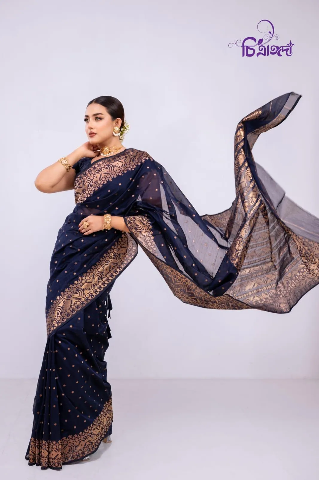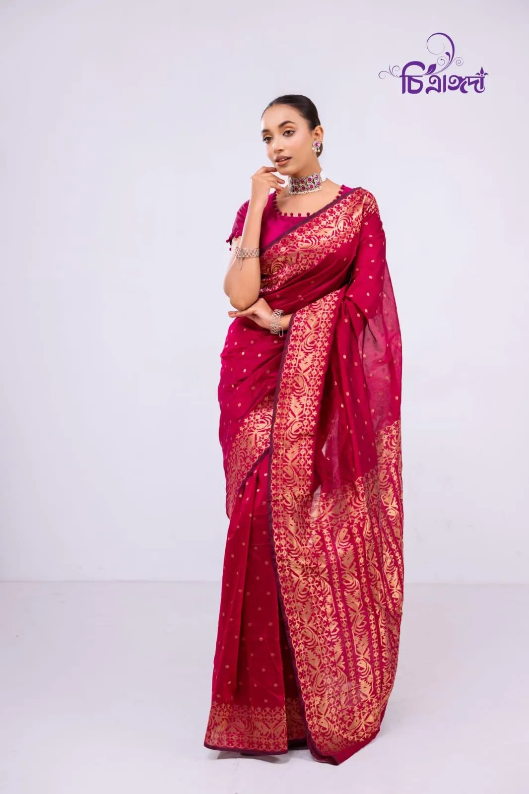 A graceful masterpiece that reflects the rich heritage of Tangail weaving, adorned with intricate jari work throughout.
