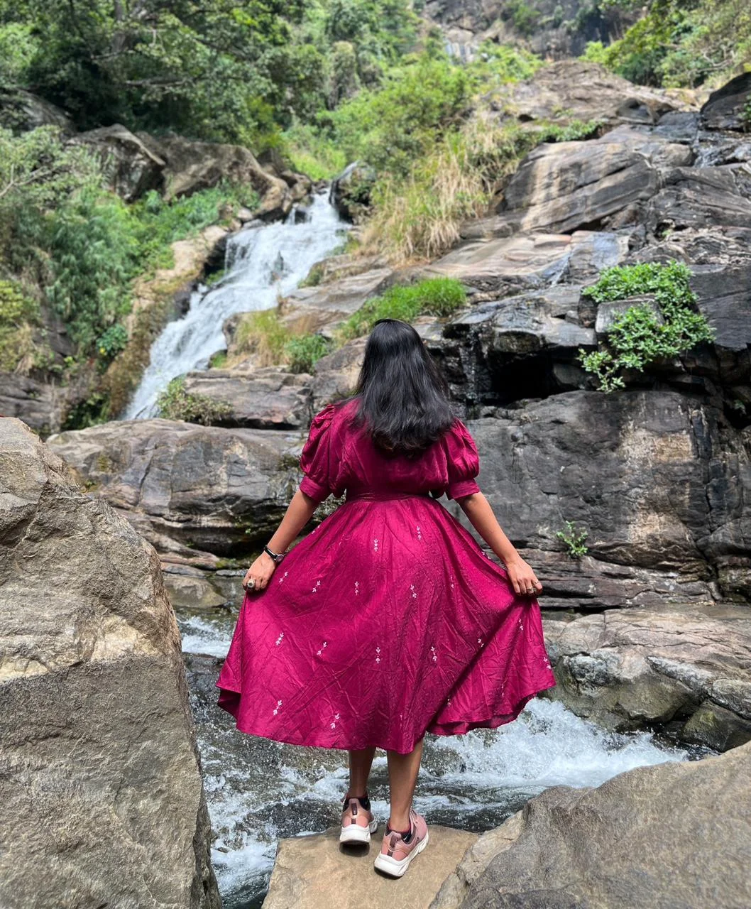 A deep wine colored dress grounded in rocky textures and forest silence. Feminine, but fierce. Rayon-linen blend with embroidery โ€” to be worn when you want to be still yet striking.